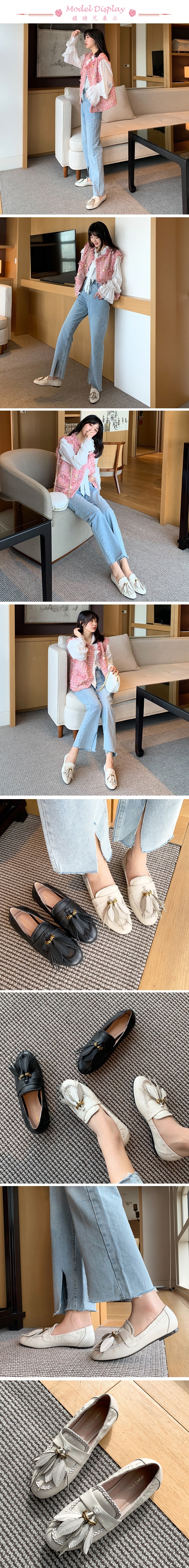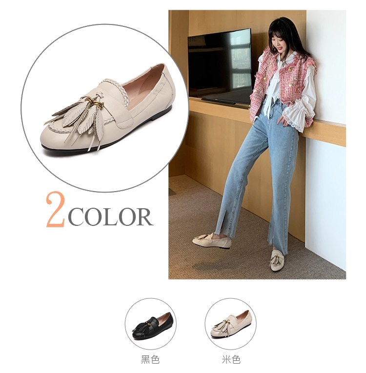 【Kissxxx】真皮麻花邊流蘇樂福鞋/真皮頭層牛皮時尚麻花邊一字帶唯美羽毛流蘇造型時尚樂福鞋 女鞋 米
