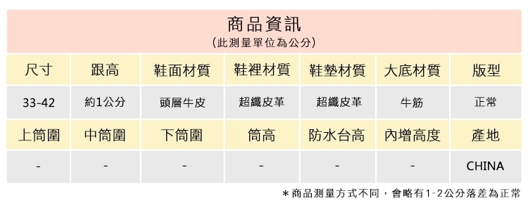 2.鞋類商品依功能及用途之不同,鞋底各有其止滑係數之個別不同,使用鞋類商品請用於正常平坦之路面,非雨鞋或雨靴類商品,請避免穿著於下雨濕滑路面上行走。