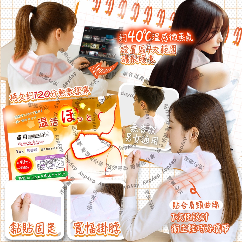 ●品名:溫活便攜1次性約40°C蒸氣溫感熱敷暖頸貼