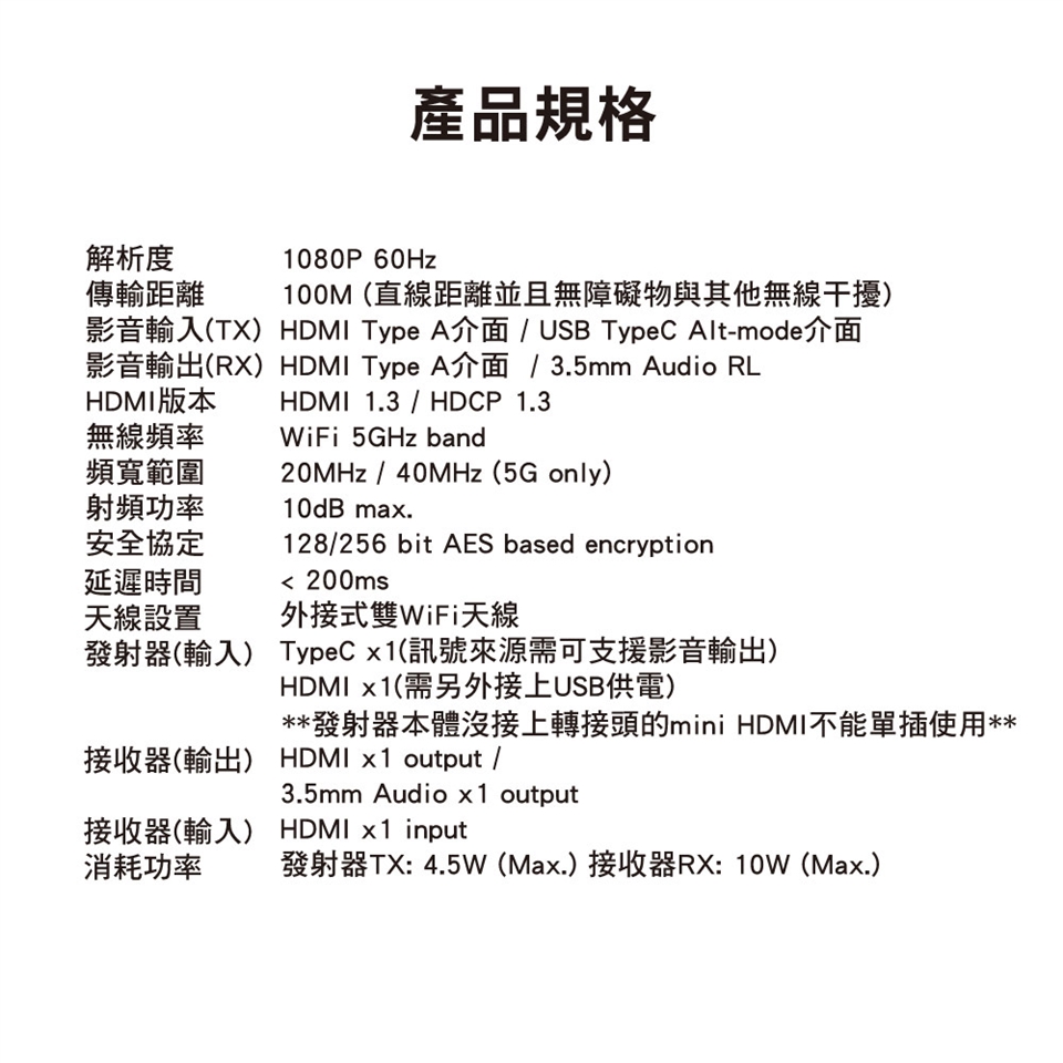 發射器(輸入):TypeC x1 / HDMI x1(USB供電)