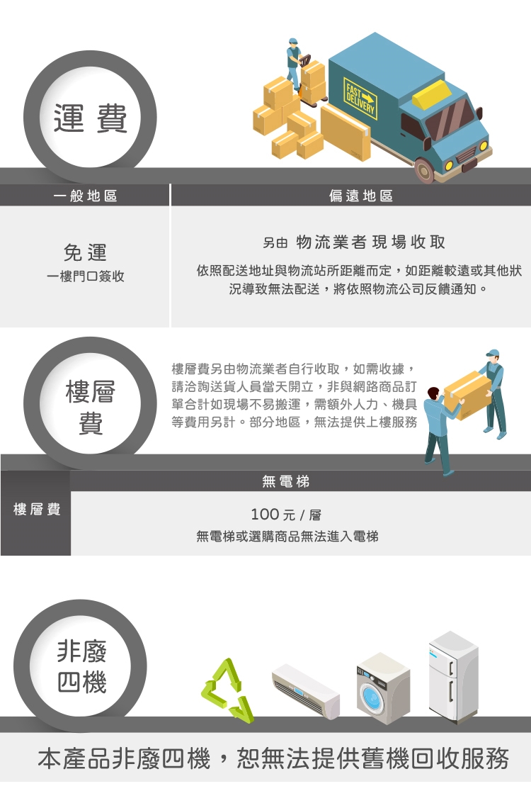 4.本商品免費運送到府不含安裝、不含拆箱定位及無舊機回收服務。