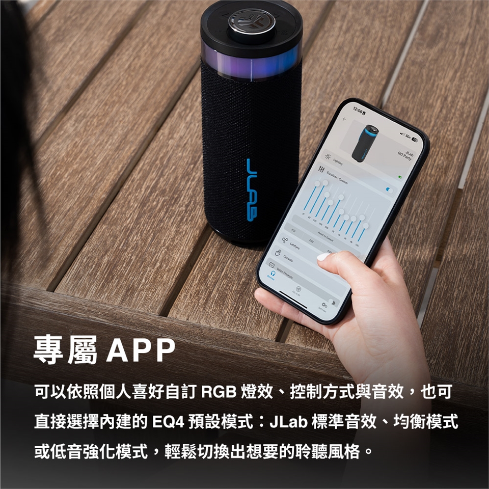 - 專屬調控| JLab App 自訂 EQ、燈效與按鍵功能。