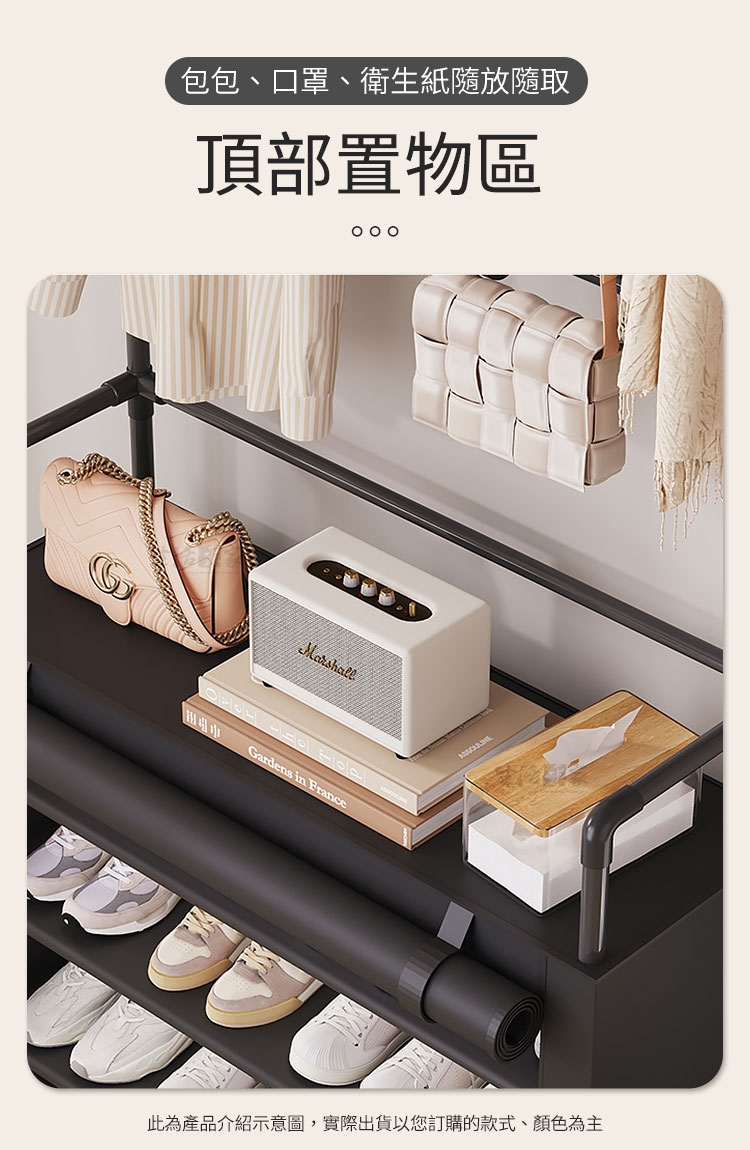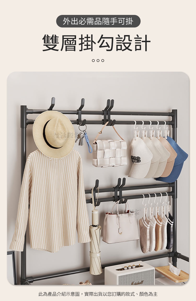 「分層分類收納」回到家順手將衣服外套、帽子、鞋子等各種物品整齊收在同一個地方,不再亂成一團。「多功能一體」,在同一個架子上就能搞定所有收納需求。「雙層掛勾」設計,讓您可以掛更多物品,使用更靈活!👕👒👟