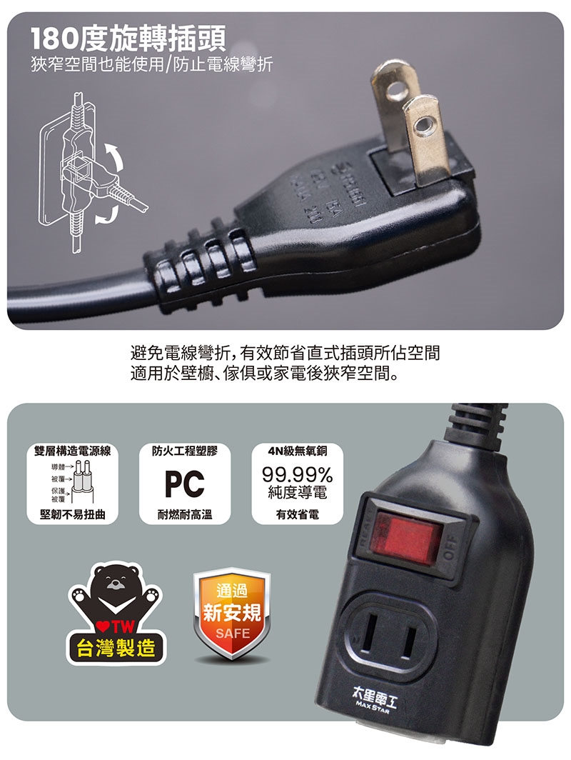 2.180度旋轉插頭:避免電線彎折,有效節省直式插頭所佔空間,適用於壁櫥、傢俱或家電後狹窄空間。