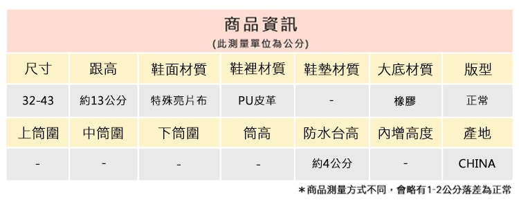 2.鞋類商品依功能及用途之不同,鞋底各有其止滑係數之個別不同,使用鞋類商品請用於正常平坦之路面,非雨鞋或雨靴類商品,請避免穿著於下雨濕滑路面上行走。