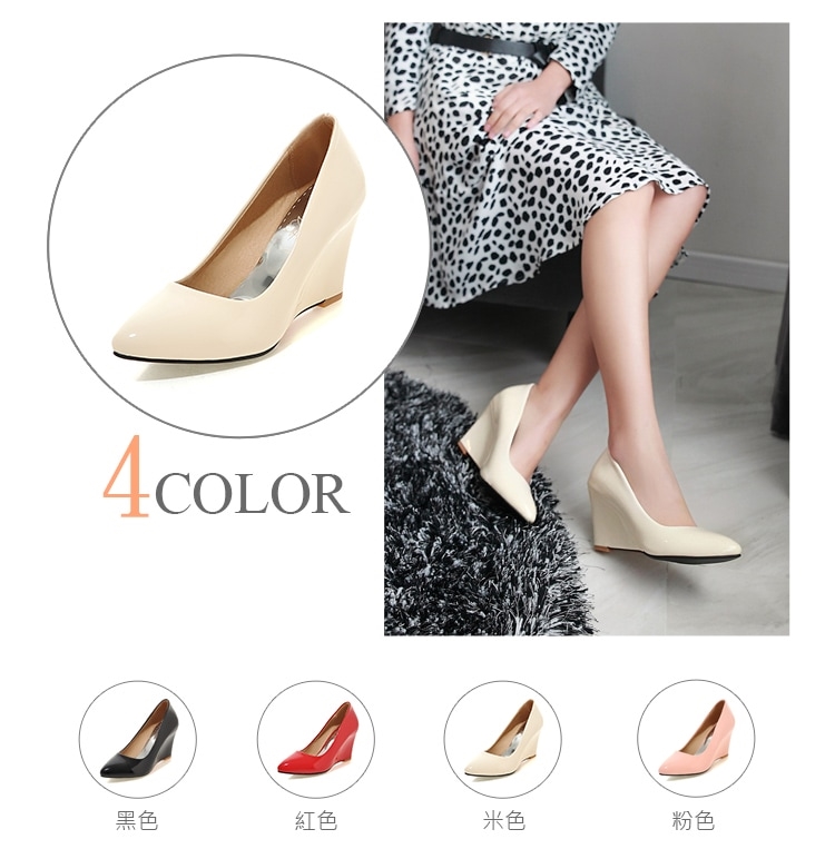 【Kissxxx】漆皮尖頭淺口楔形高跟鞋/亮漆皮尖頭淺口復古楔形高跟鞋 女鞋 米