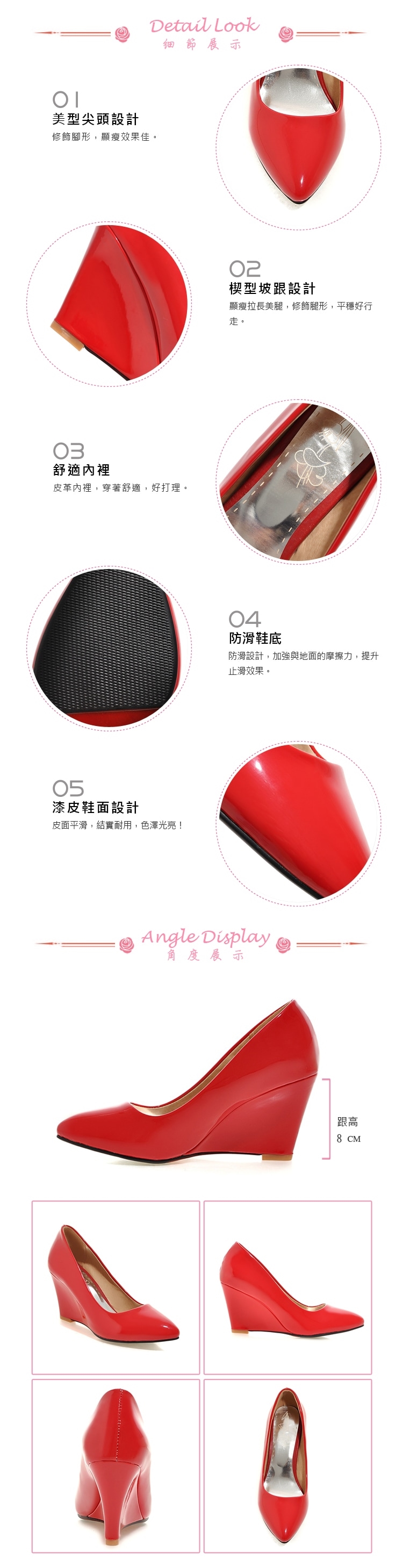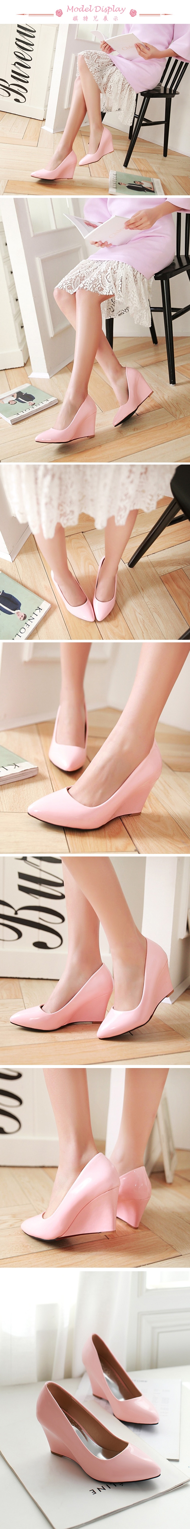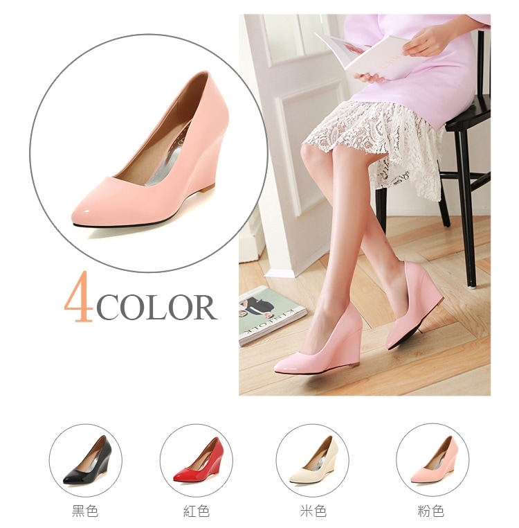 【Kissxxx】漆皮尖頭淺口楔形高跟鞋/亮漆皮尖頭淺口復古楔形高跟鞋 女鞋 粉