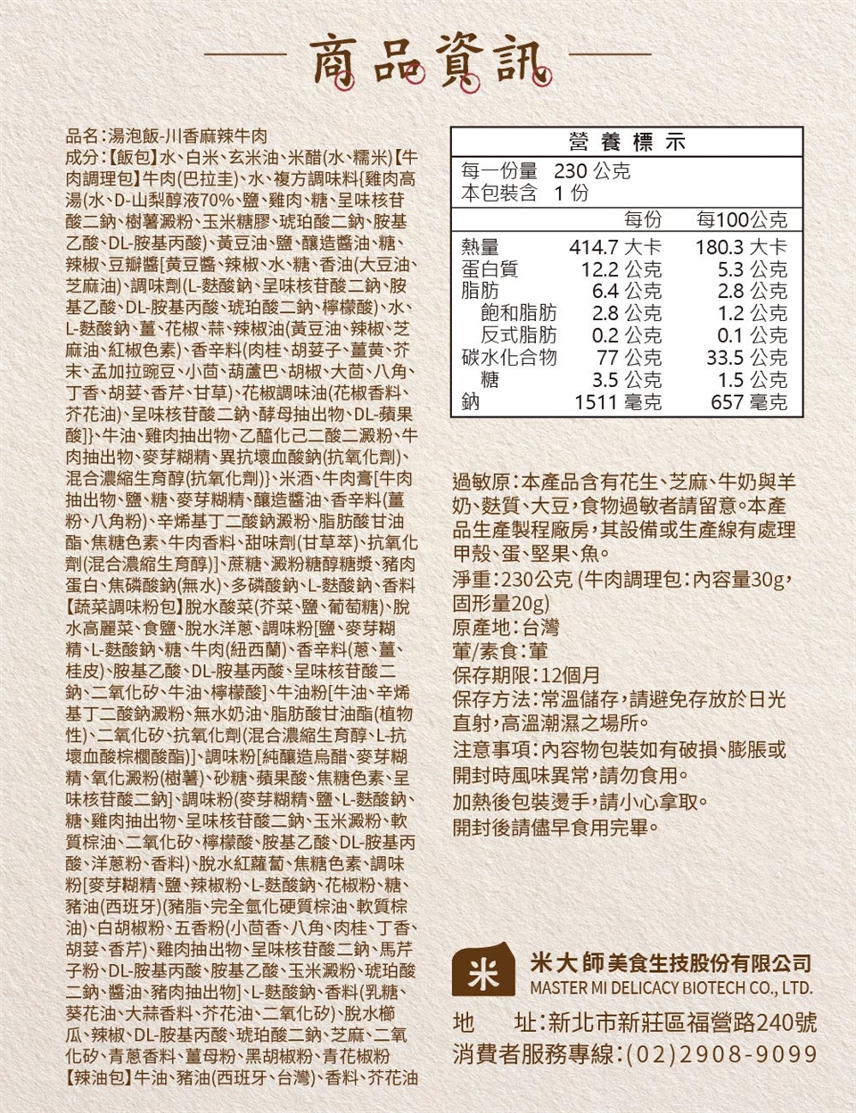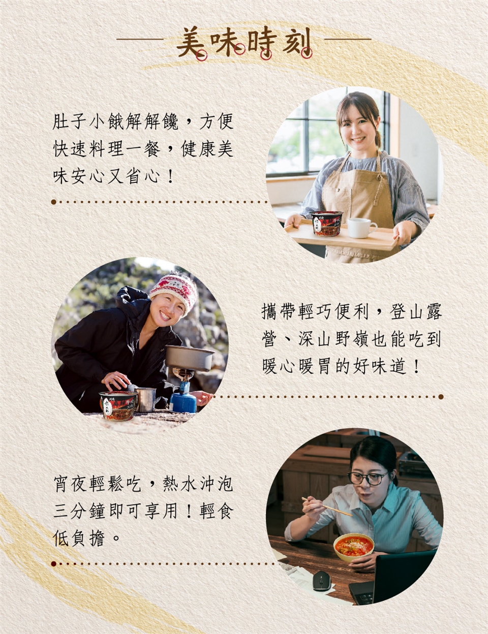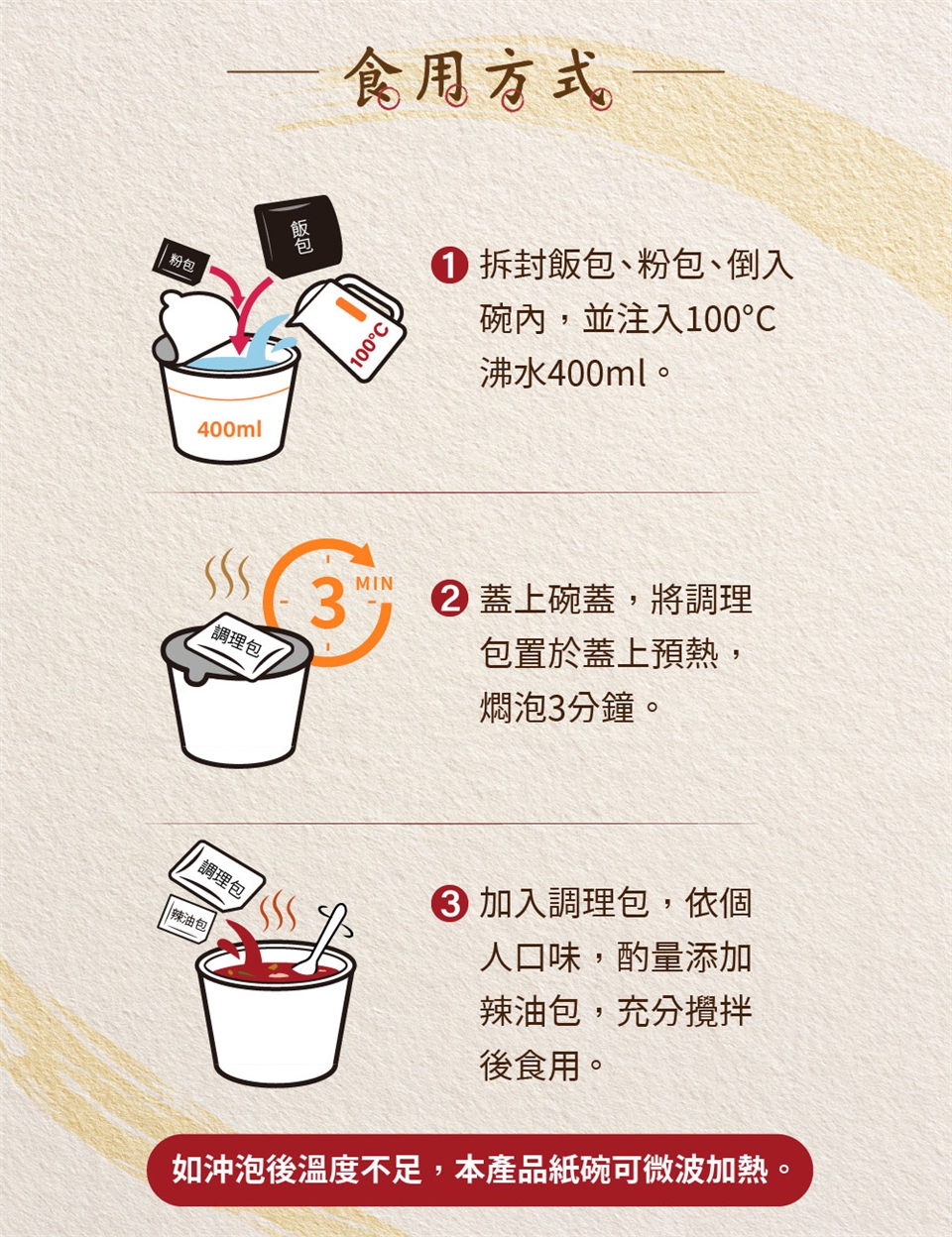 商品詳細介紹 體驗說明 不可體驗 使用方法說明 請參閱商品內圖說明 注意事項 請將商品常溫保存,避免放置於陽光直射、高溫潮濕之場所。內容物包裝如有膨脹或破損請勿食用,加熱後請小心燙口,開封後請儘早食用完畢。