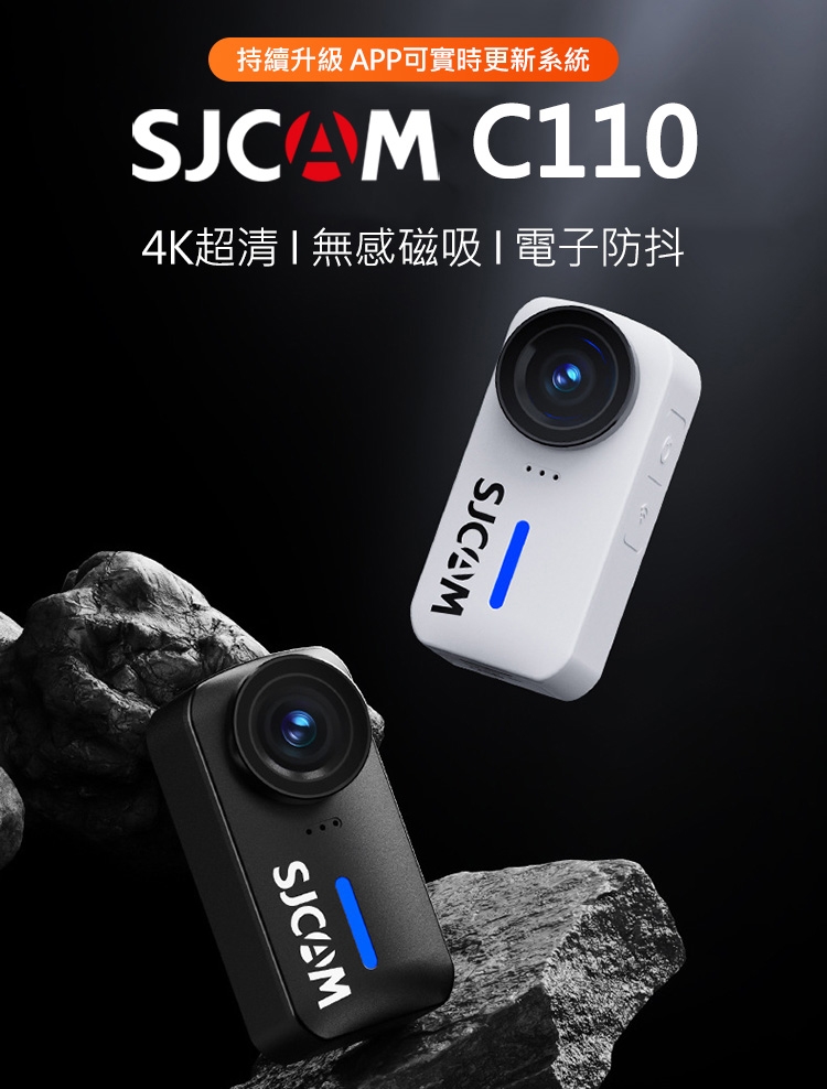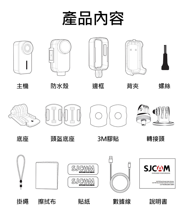 .產品內容:C110主機X1、防水殼X1、邊框X1、背夾X1、鎖緊螺絲X1、底座X1、頭盔底座X2、3M膠貼X2、雲台轉接頭X1、、1/4轉接頭X1、掛繩X1、擦拭布X1、SJCAM貼紙X1、Type-C數據線X1、說明書X1