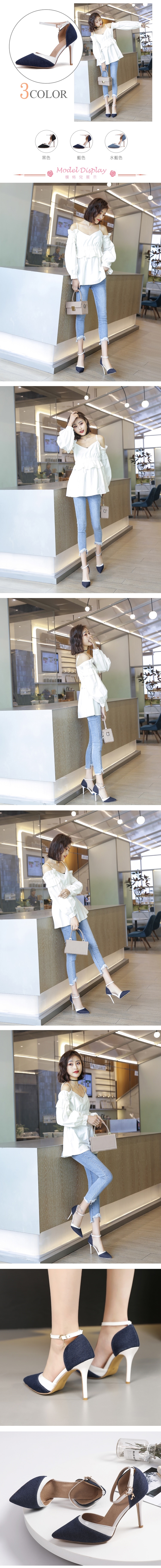 【Kissxxx】牛仔尖頭撞色漆皮高跟涼鞋/牛仔布尖頭撞色漆皮滾邊拼接高跟涼鞋 女鞋 藍