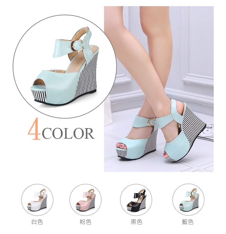 【Kissxxx】線條魚口楔形涼鞋/時尚復古線條魚口露趾楔形涼鞋 女鞋 藍