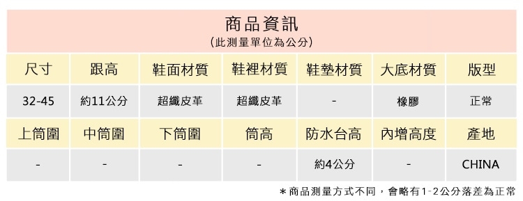2.鞋類商品依功能及用途之不同,鞋底各有其止滑係數之個別不同,使用鞋類商品請用於正常平坦之路面,非雨鞋或雨靴類商品,請避免穿著於下雨濕滑路面上行走。
