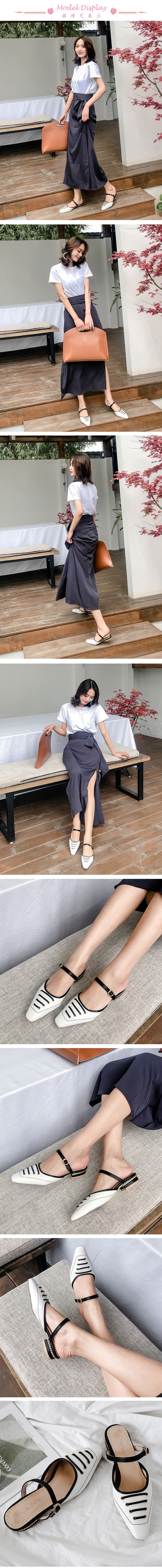 【Kissxxx】方頭撞色包頭低跟拖鞋/個性小方頭撞色線條金屬跟飾包頭低跟拖鞋 穆勒鞋 女鞋 白