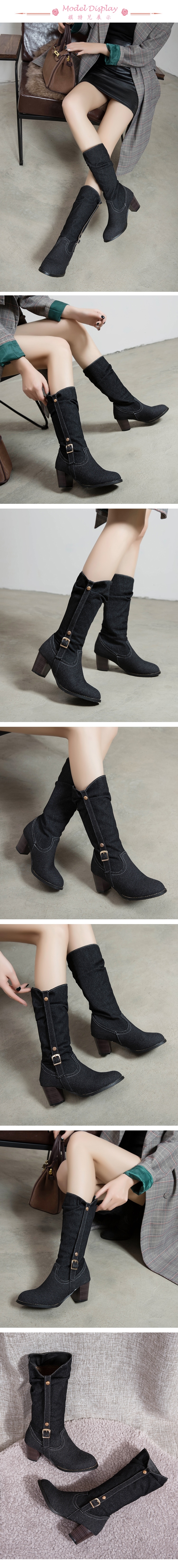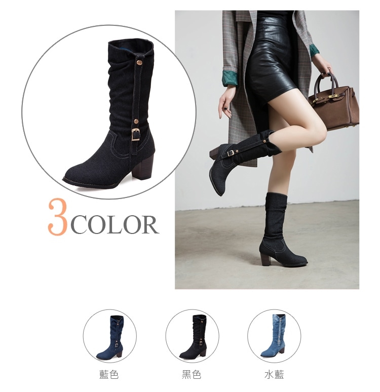 【Kissxxx】皮帶釦牛仔布粗跟中筒靴/復古皮帶釦飾牛仔布造型百搭粗跟中筒靴 女鞋 黑