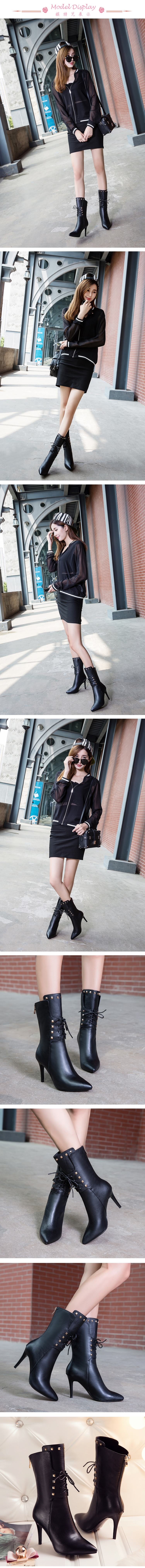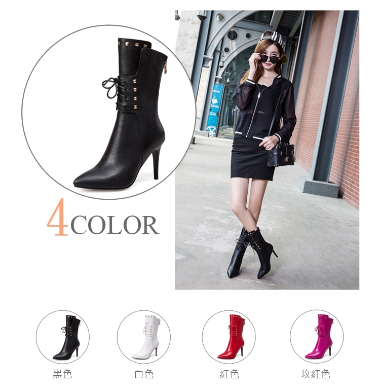 【Kissxxx】真皮鉚釘尖頭高跟中筒靴/真皮頭層牛皮時尚鉚釘尖頭繫帶高跟中筒靴 女鞋 黑
