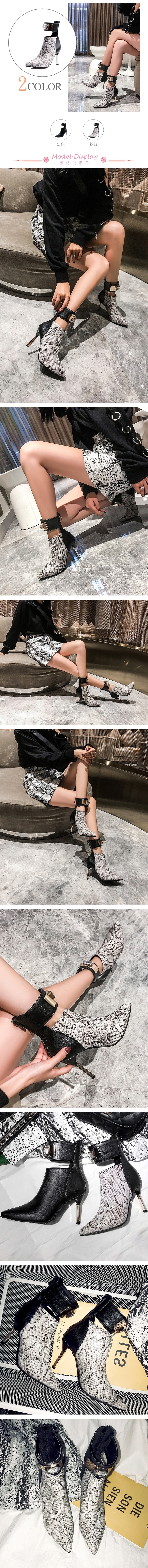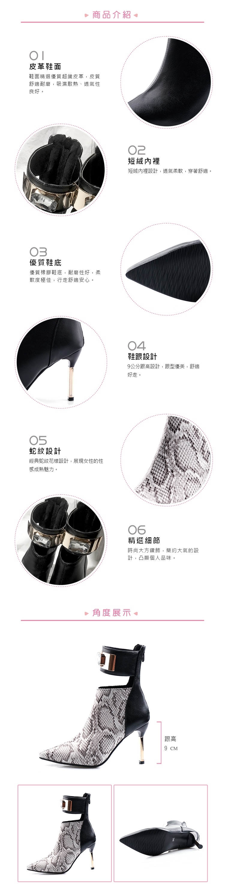 【Kissxxx】寶石拼接尖頭細高跟短靴/個性腳踝寶石飾帶拼接造型尖頭細高跟短靴 女鞋 蛇紋