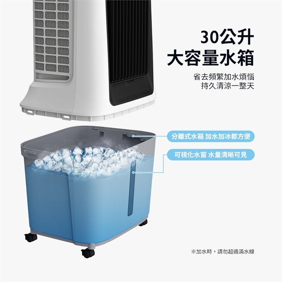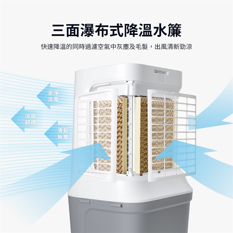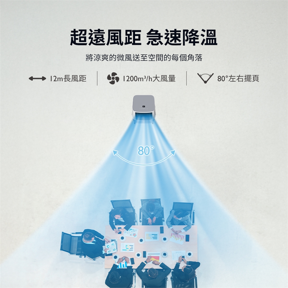 三面水簾+7片大扇葉,送風可達12米,快速降溫