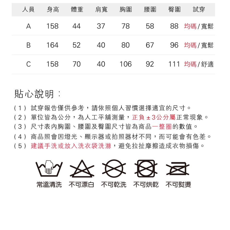 ●商品第一次穿戴前,深淺色請分開或單獨洗滌。