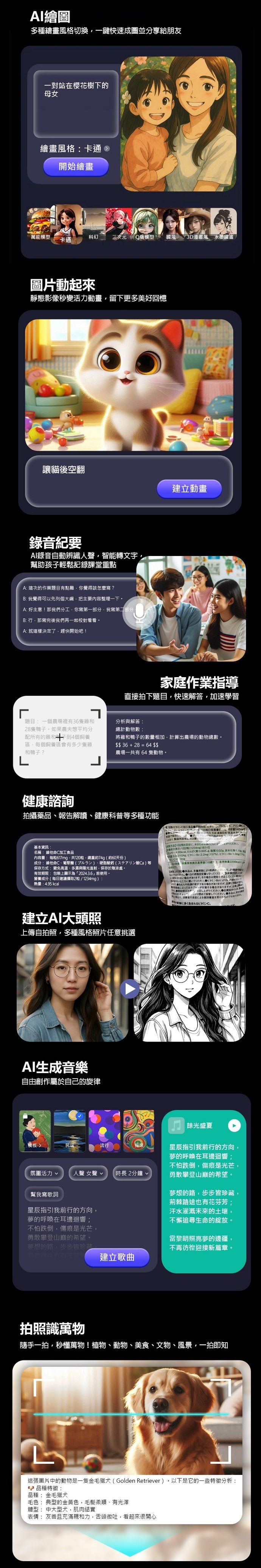 ★ Ai繪圖/照片動起來/錄音/拍照識萬物/作業指導/健康/AI音樂/百科/記帳等