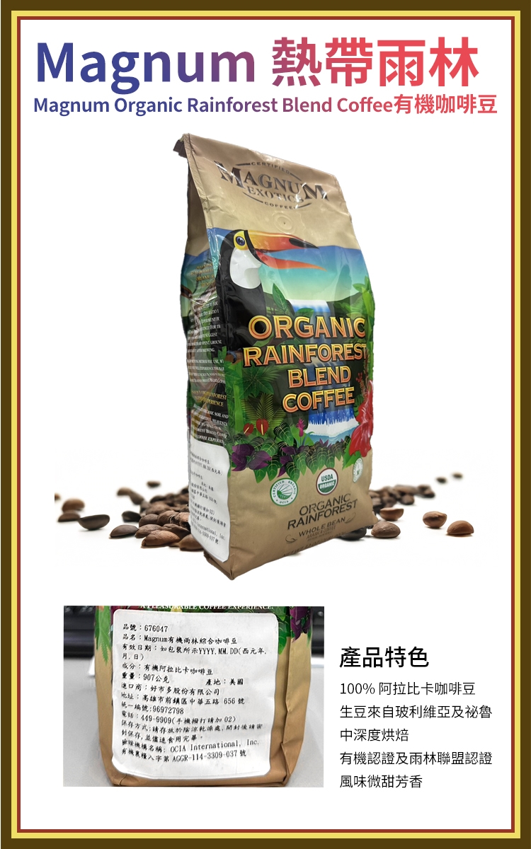 品名:Magnum 熱帶雨林有機咖啡豆 907公克