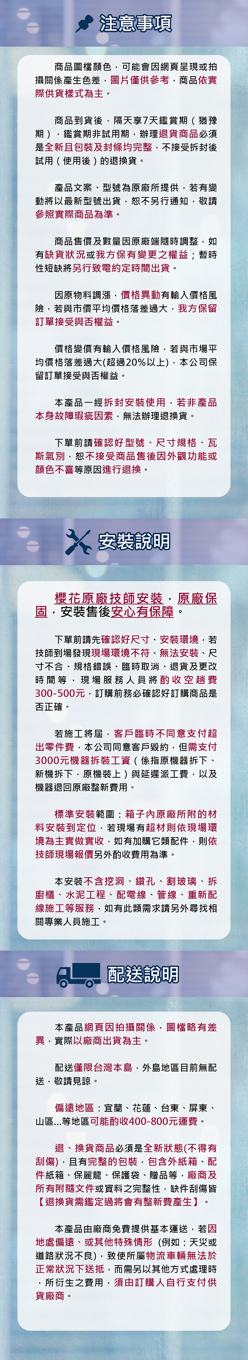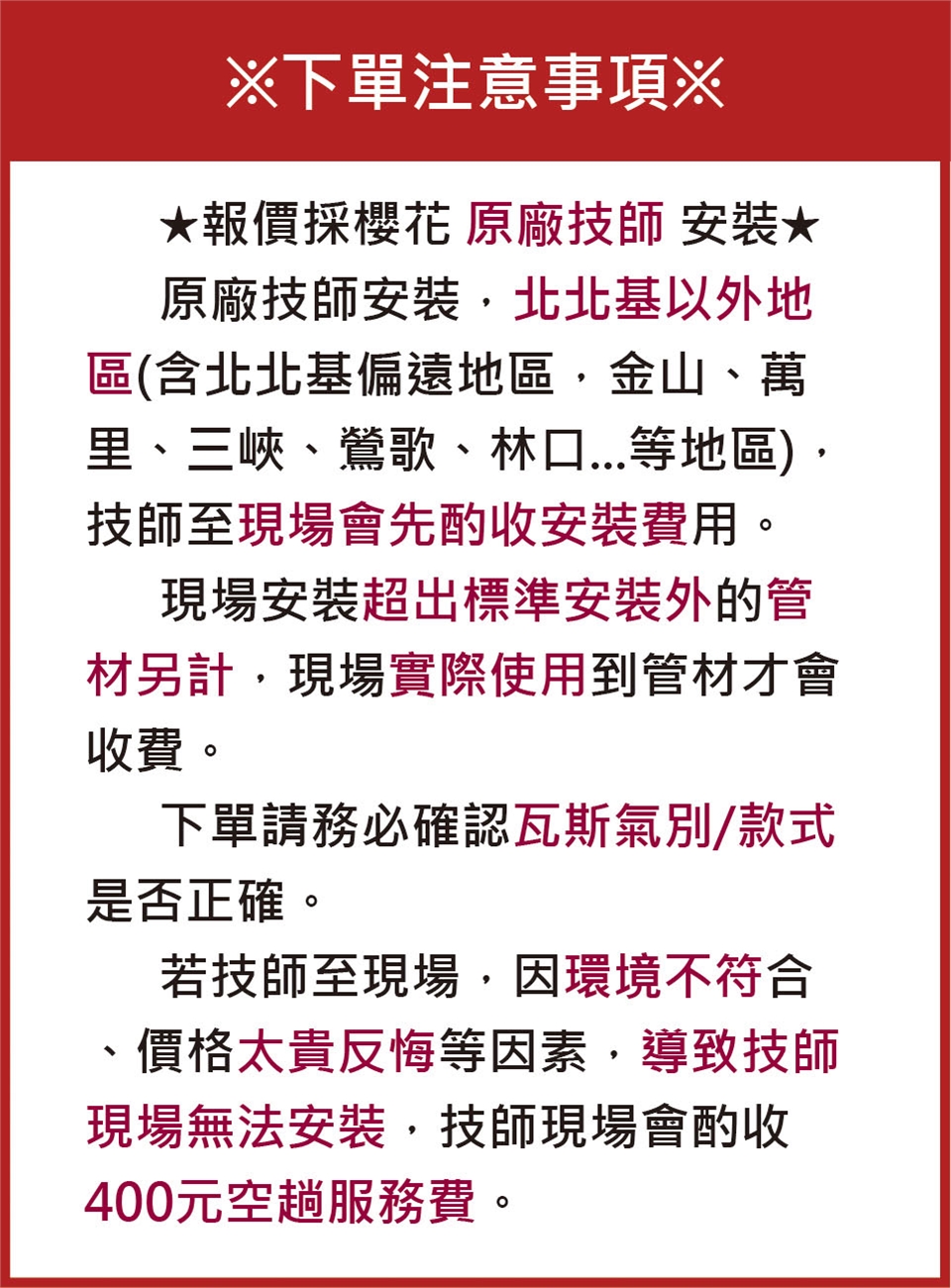 下單前請先確認好尺寸、安裝環境,若技師到場發現現場環境不符、無法安裝、尺寸不合、規格錯誤、臨時取消、退貨及更改時間等,現場服務人員將酌收空趟費300-500元,訂購前務必確認好訂購商品是否正確。