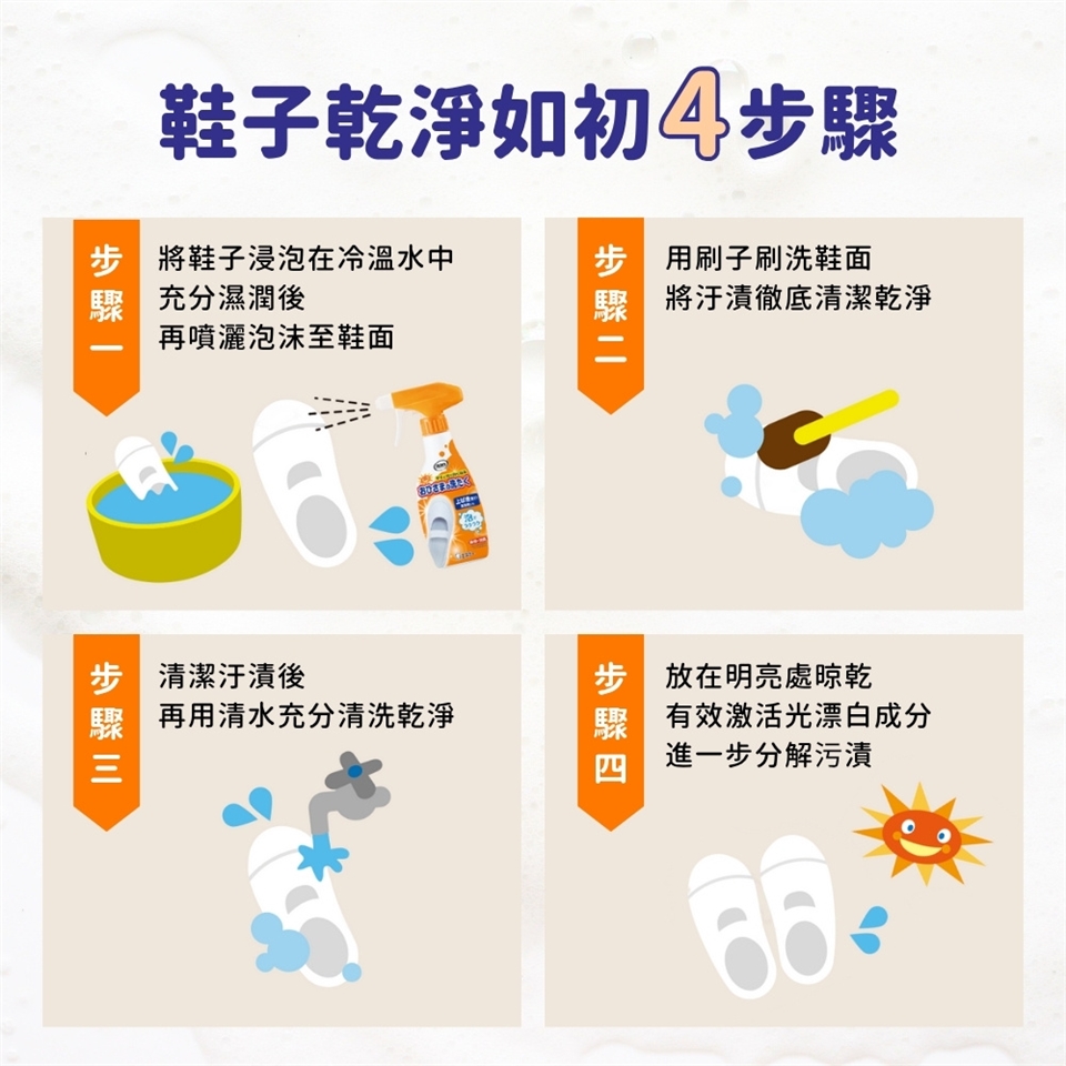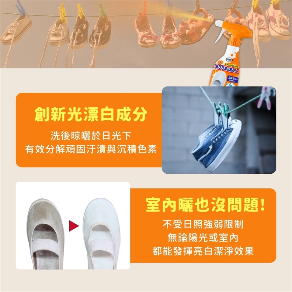 ● 採用創新「光漂白成分」,洗後晾曬於日光下即可啟動淨白作用,有效分解頑固污漬與沉積色素,白鞋潔白如新,彩色鞋款也能安心使用。