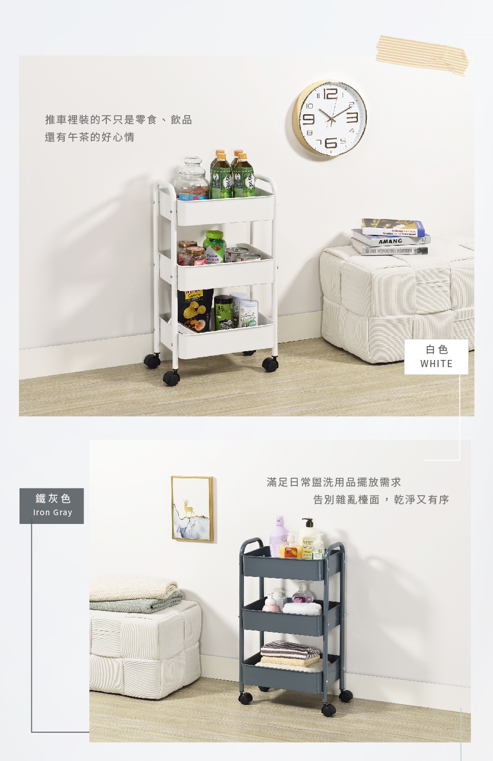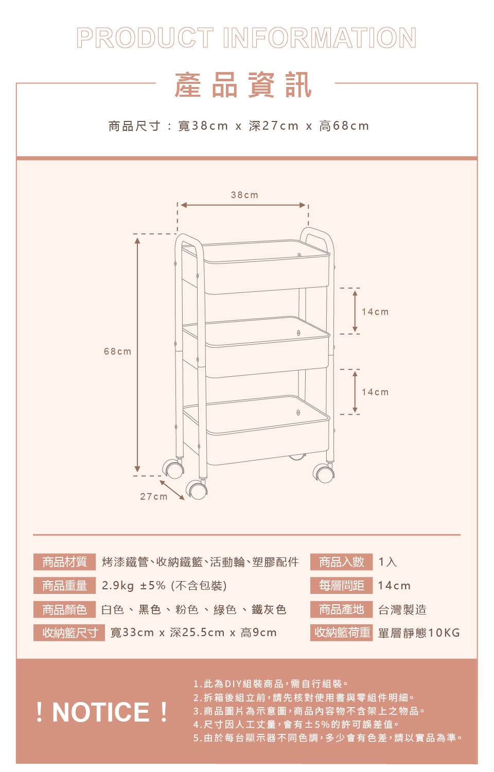 商品材質 : 烤漆鐵管、收納鐵籃、活動輪、塑膠配件