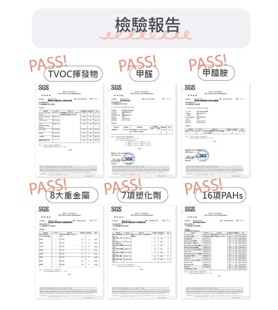 地墊符合目前國家CNS多項標準規範:16項PAHs多環芳香烴化合物、游離甲醛、TVOC總輝化性化合物質等等多樣安全檢測。