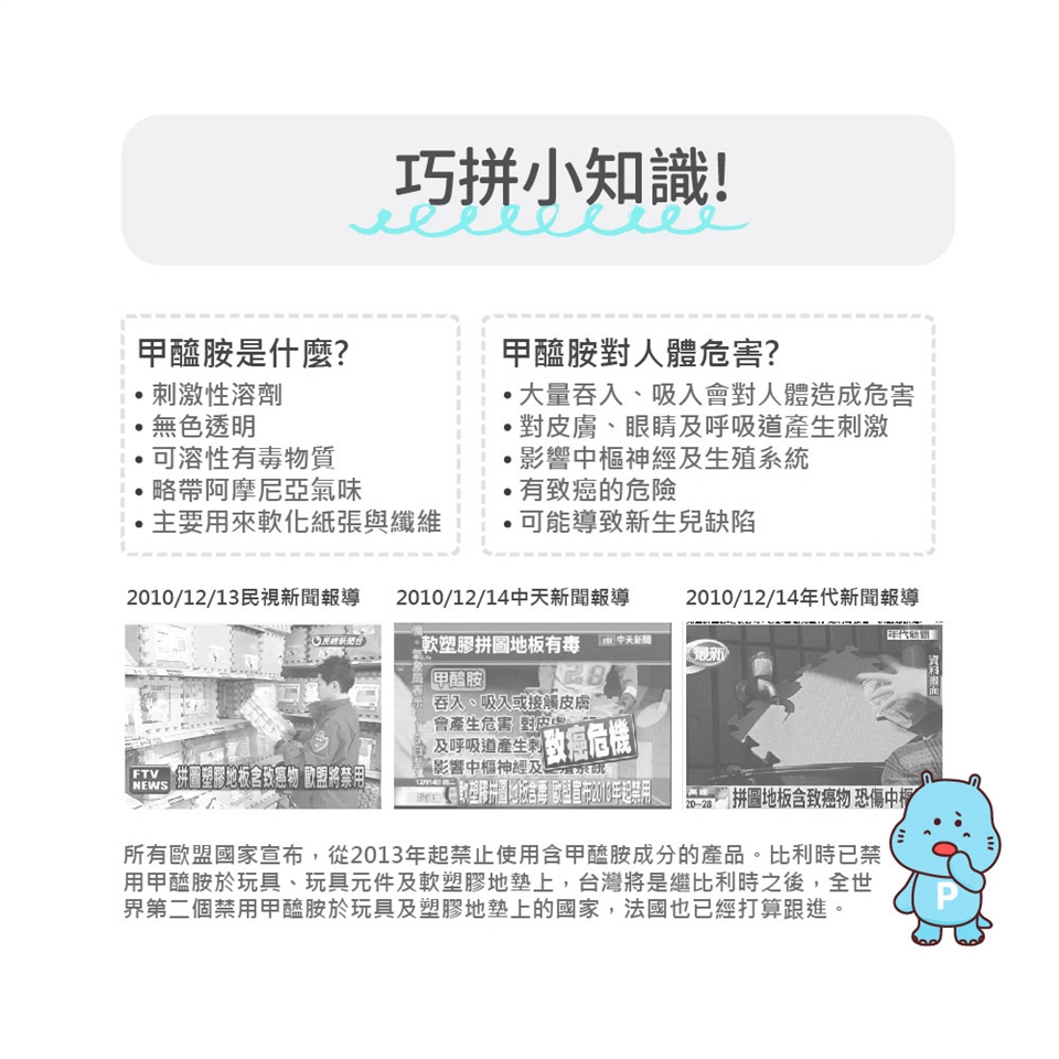 研究指出孩童接觸塑化劑將阻礙其發展甚至造成發育功能障礙,選擇無塑化劑的地墊對幼童才有保障,塑化劑那麼多種!新生活家一次幫您做到測底把關!地墊皆通過八大塑化劑檢測:鄰苯二甲酸甲苯基丁酯(BBP)、鄰苯二甲酸二丁酯(DBP)、鄰苯二甲酸二(2-乙基己基)酯(DEHP)、鄰苯二甲酸二異癸酯(DIDP)、鄰苯二甲酸二異壬酯(DINP)、鄰苯二甲酸二正辛酯、(DNOP)鄰苯二甲酸二甲酯(DMP)、鄰苯二甲酸二乙酯(DEP)。