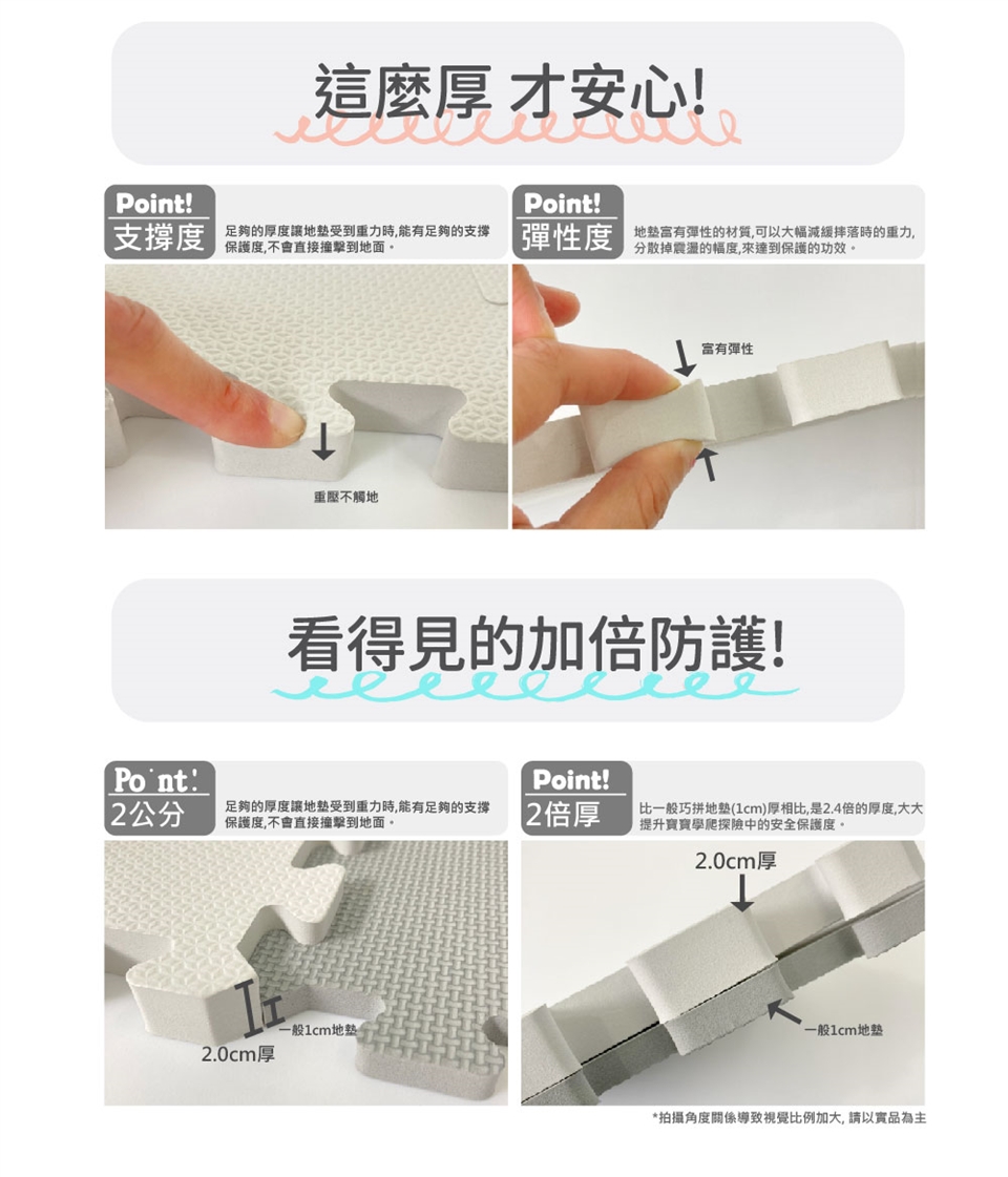 🔆【緩衝】 EVA地墊富有極佳的彈性,能有效減緩接觸地面時的震力,可保護孩童及年長者,降低跌倒、碰撞到堅硬地面時所造成的傷害。