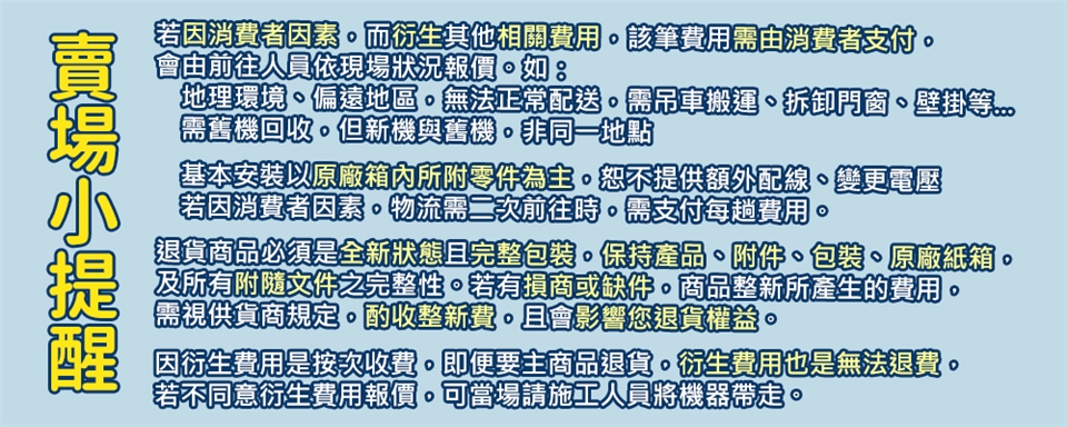 2.購買時請確認商品大小與裝機尺寸,師傅已到達指定地點並到府基本安裝時(已拆箱),倘若退貨原因是「尺寸大小不符導致無法搬運及安裝、並非新品不良」,必須收外箱整新費3,000元。