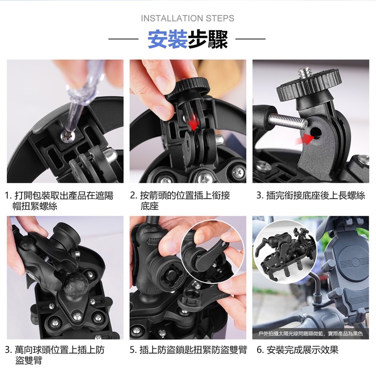 內容物:防盜雙插臂,鎖匙x1遮陽帽x1GoPro接底座x1墊片x1遮陽帽安裝螺絲x1後視鏡底座,增高螺絲x1