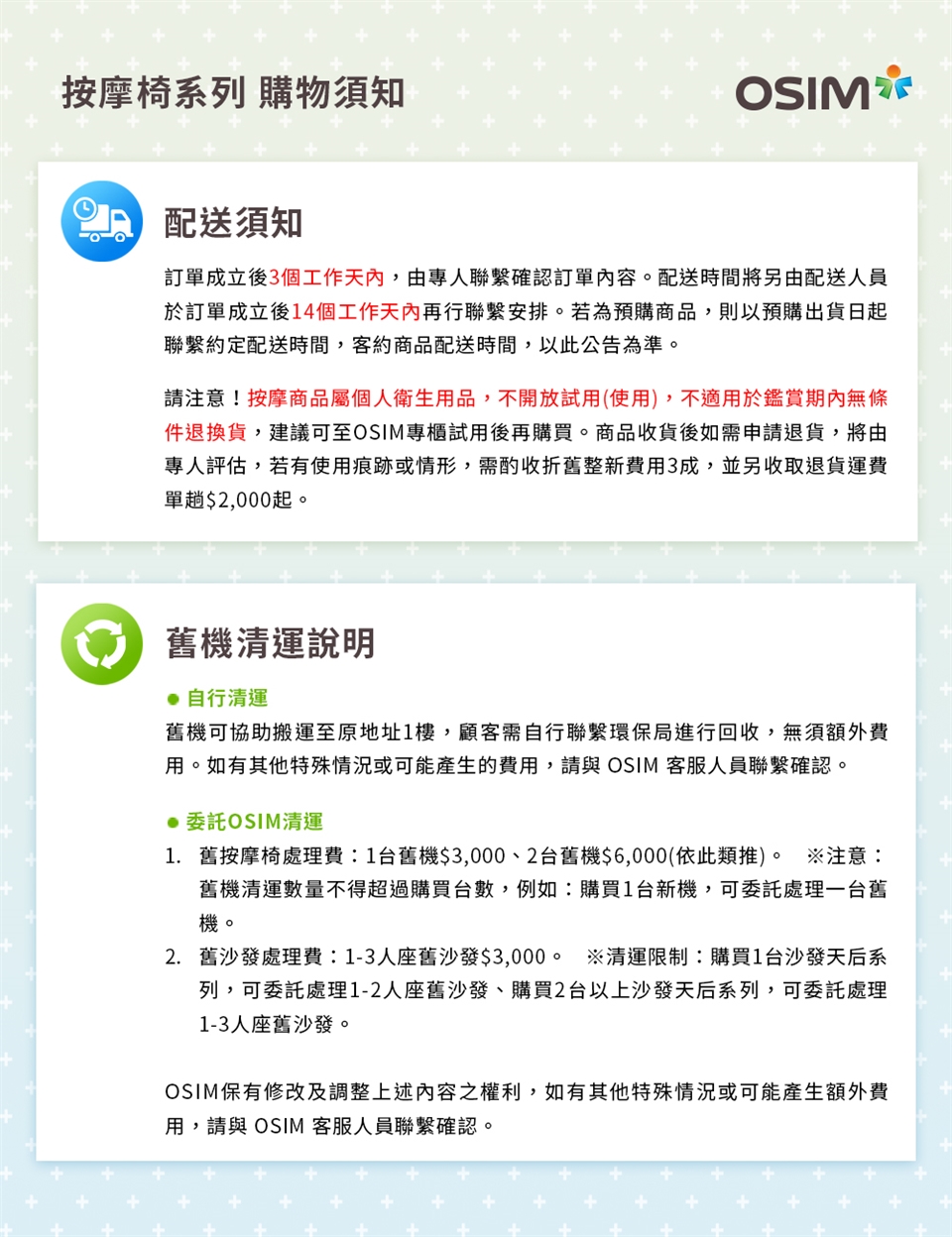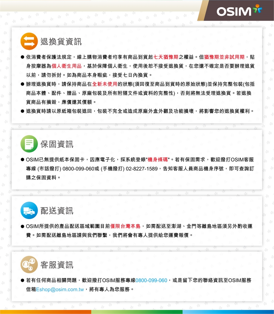 ※訂單確認說明:OSIM網路訂單於接單後1-2個工作天內會有專人聯繫確認訂單內容。