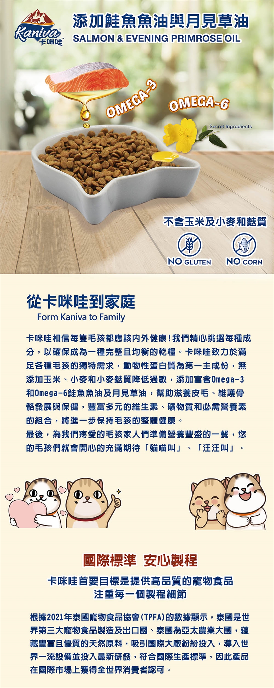 粗蛋白質32%以上,粗脂肪17%以上,粗纖維5.5%以下,水分 8.5%以下,,鈣 1.0%以上,磷 0.8%以上,鈉  0.2%以上,氯化物 0.3%以上,牛磺酸0.1%以上