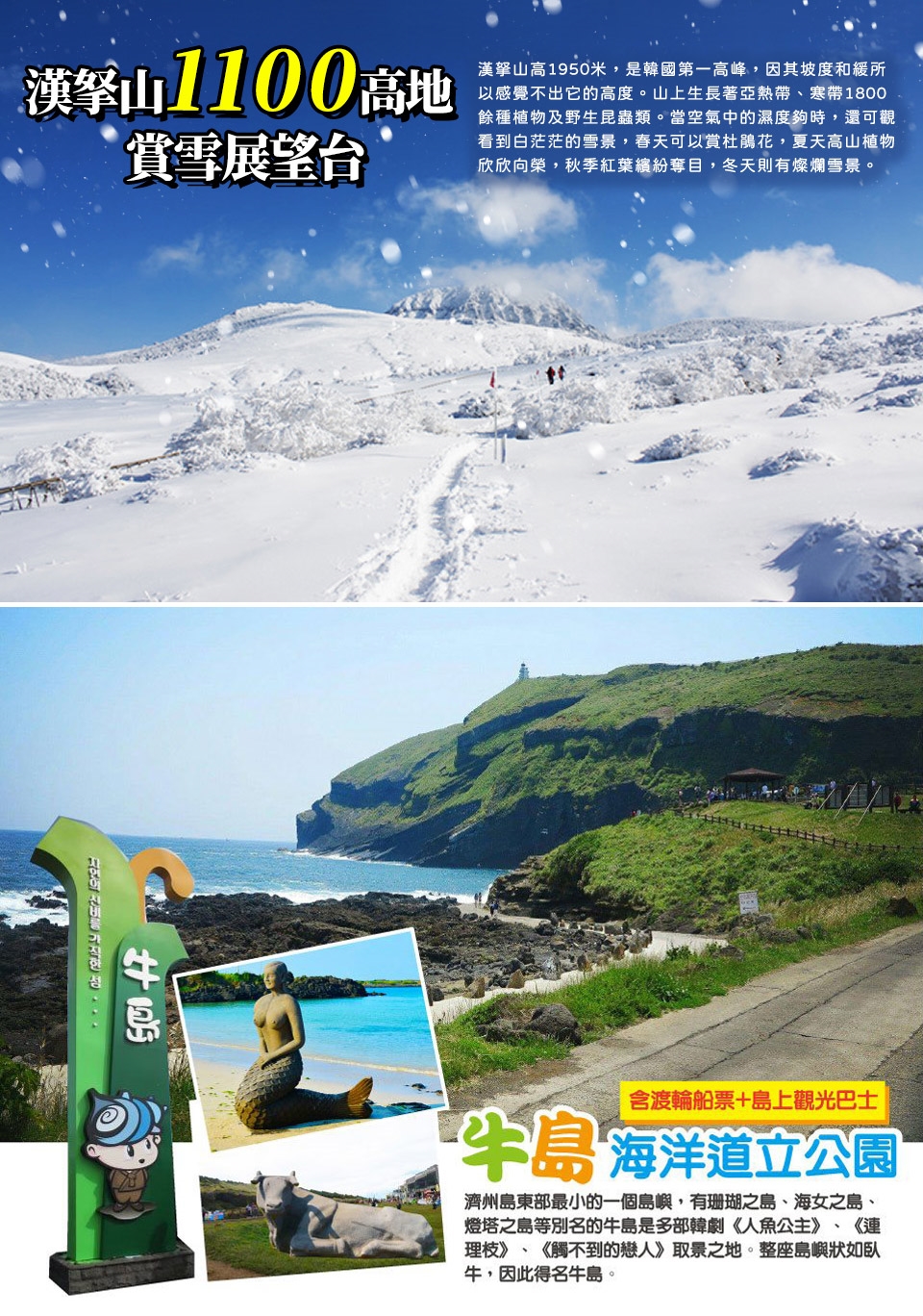 【第3天】 島中之島~牛島海洋道立公園(含渡輪+環島觀光巴士)-城邑民俗村【贈送每人一杯蜂蜜茶或五味子茶(2選1)】-漢拏山1100高地賞雪展望台-海女博物館-蓮洞商圈 |