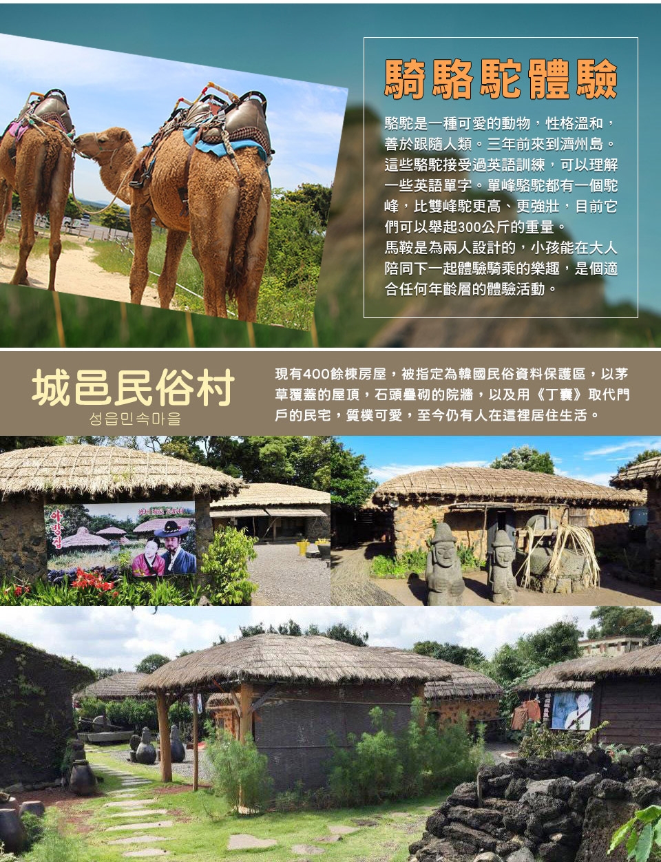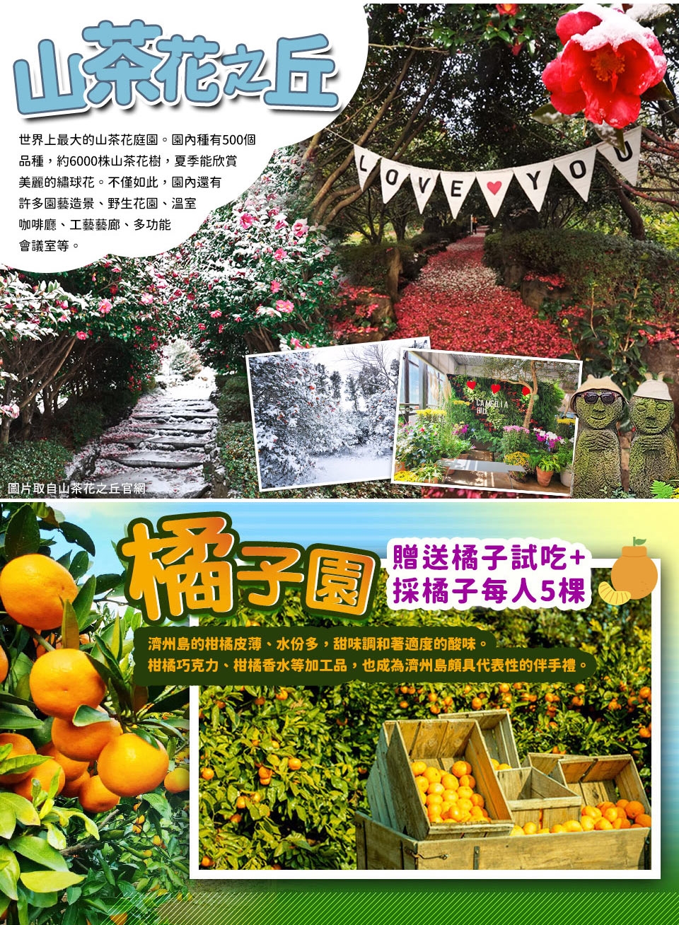 【第2天】 山茶花之丘(Camellia Hill)-濟州橘子園(贈送橘子試吃+採橘子每人5棵)-騎駱駝體驗-濟州阿里郎『魂』跆拳武藝秀-東門傳統市場(食尚玩家推薦、美食大探索) |