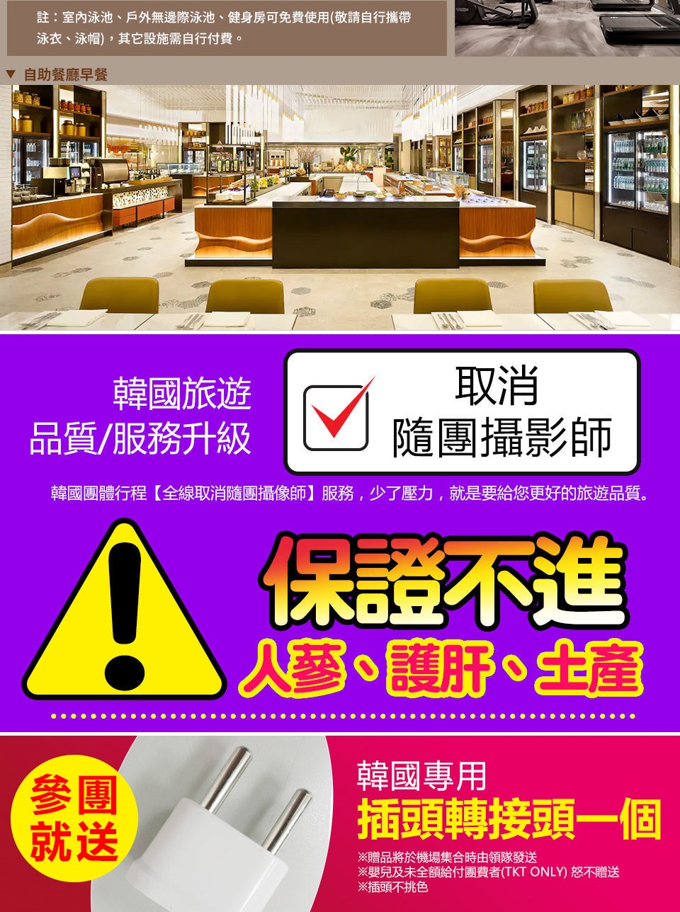 ※韓國飯店及渡假村因響應環保,請自行攜帶牙刷、牙膏、拖鞋、香皂、洗髮精及個人習慣性藥品。