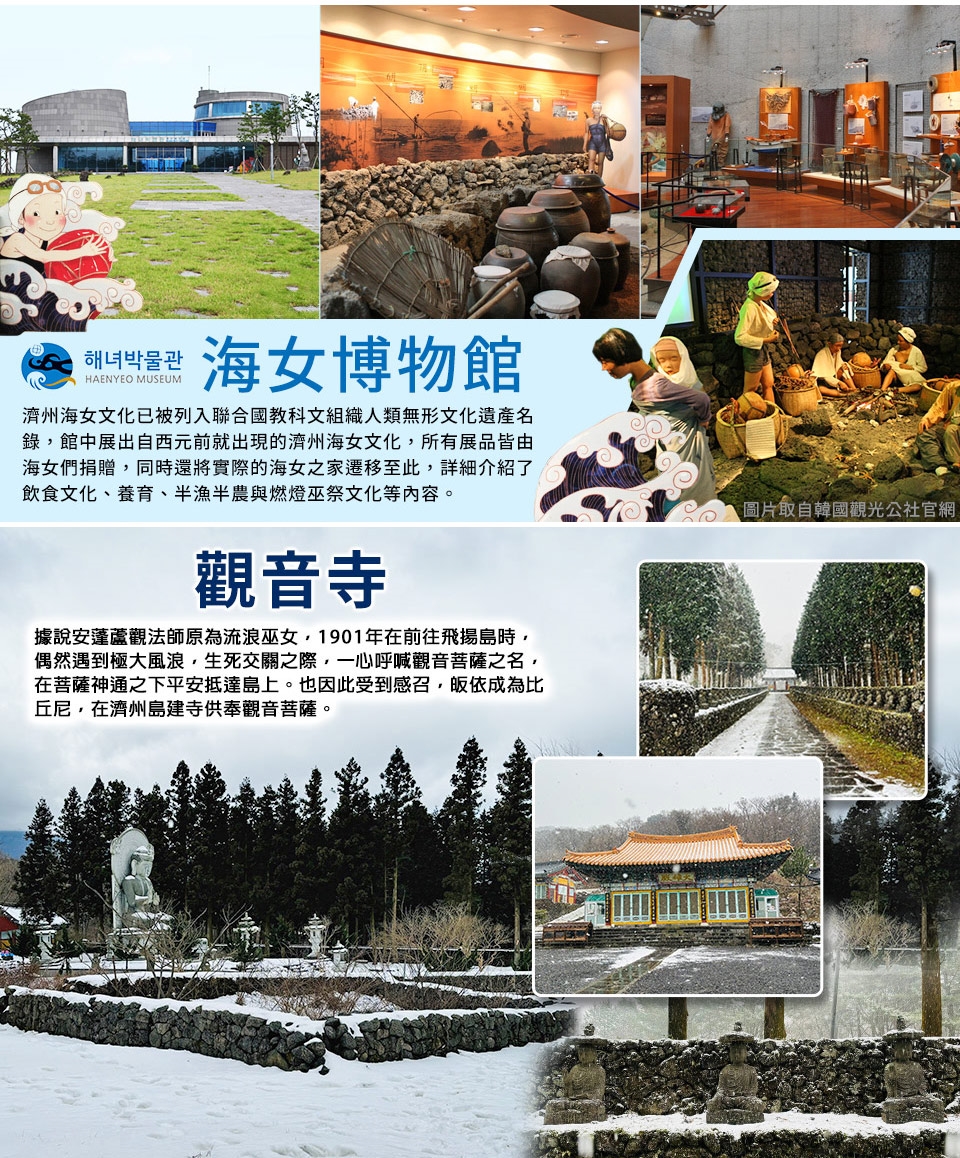【觀音寺】朝鮮王朝以儒教為國教,肅宗時曾任濟州牧使的李衡祥認為當地的雜神信仰過多,查封了500多間祠堂與寺院,使眾多寺院成為廢墟。如今的觀音寺,是1912年在比丘尼安蓬蘆觀法師的主持下重建的,當時名為法井庵。據說安蓬蘆觀法師原為流浪巫女,1901年在前往飛揚島時,偶然遇到極大風浪,生死交關之際,一心呼喊觀音菩薩之名,在菩薩神通之下平安抵達島上。也因此受到感召,皈依成為比丘尼,在濟州島建寺供奉觀音菩薩。然而由於居民的反對,只好避至漢拏山,1912年在靈峰法師與道月居士的幫助下創建法井庵,之後因信徒增加,改名為「觀音寺」。 早餐:飯店內 午餐:漁夫廚房~超級海鮮鍋(活章魚.鮑魚.蟹.貝類.蝦)+煎餅+烤魚+韓式小菜 晚餐:發放韓幣6000 |