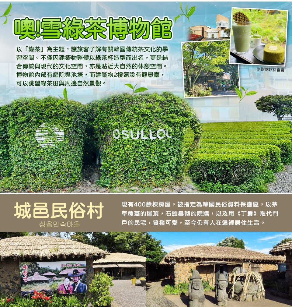 【第3天】 精裝彩妝坊-HARIBO小熊軟糖歡樂世界-城邑民俗村【贈送每人一杯蜂蜜茶或五味子茶,2選1】-濟州橘子園(贈送橘子試吃+採橘子每人5棵)-噢!雪綠茶博物館-偶來市場 |