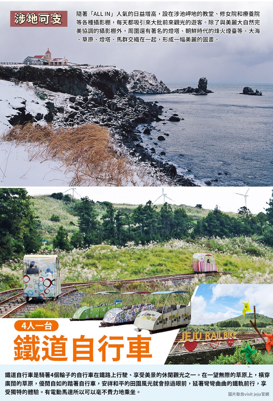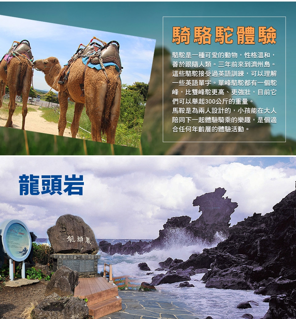 【第2天】 鐵道自行車(4人一台)-濟州阿里郎『魂』跆拳武藝秀-騎駱駝體驗-UNESCO世界自然遺產~城山日出峰-涉地可支-韓流文化體驗(韓式飯捲DIY+傳統韓服體驗)-蓮洞商圈 |