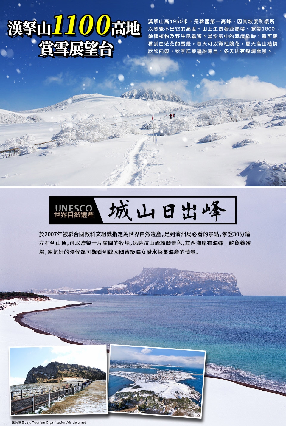 【漢拏山1100高地賞雪展望台】漢拏山高1950米,是韓國第一高峰,因其坡度和緩所以感覺不出它的高度。山上生長著亞熱帶、寒帶1800餘種植物及野生昆蟲類。當空氣中的濕度夠時,還可觀看到白茫茫的雪景,春天可以賞杜鵑花,夏天高山植物欣欣向榮,秋季紅葉繽紛奪目,冬天則有燦爛雪景。 早餐:飯店內 午餐:鮑魚澎派海鮮鍋(章魚.螃蟹.時令貝類)+煎餅+拉麵+季節小菜 晚餐:方便逛街 敬請自理 |