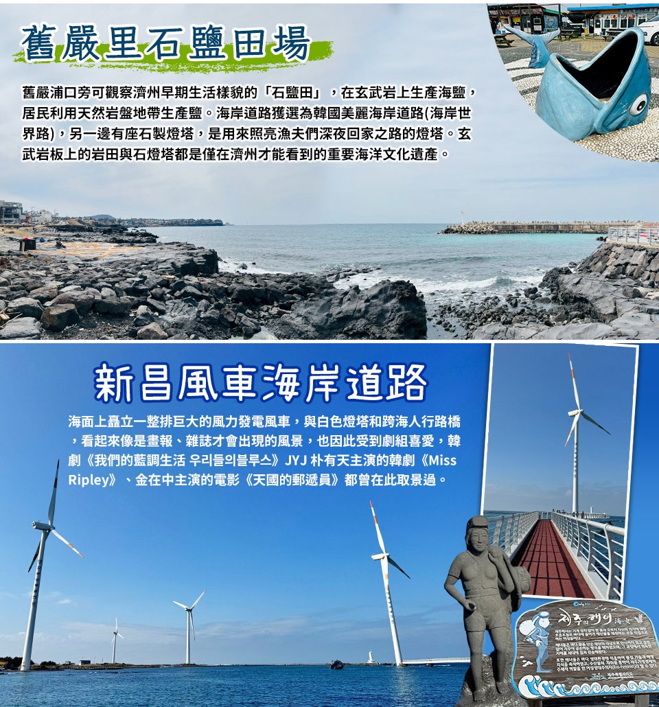 【第4天】 漢拏山1100高地賞雪展望台-海洋文化遺產~舊嚴里石鹽田場-新昌風車海岸道路-特色咖啡店~可口可樂主題館(贈每人咖啡乙杯)-綠茶足浴體驗-E-MART超市-東門傳統市場(食尚玩家推薦、美食大探索) |