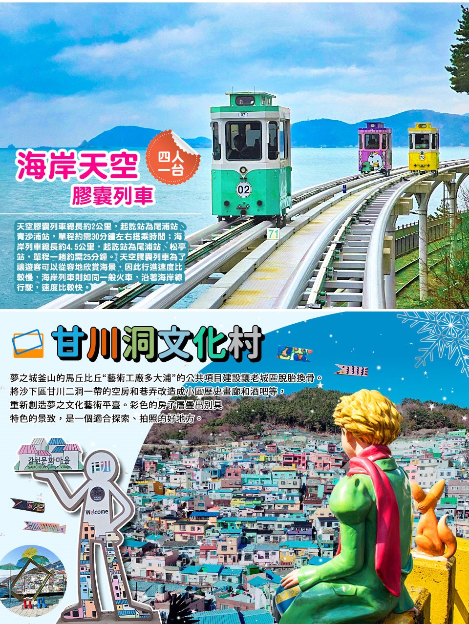 【海岸天空膠囊列車(4人一台)】經過釜山政府大力的推動觀光,讓海雲台這一帶活絡起來,而過去是廢棄路線的釜山「東海南部線」,從廢棄的尾浦站,與青沙浦、松亭串連起來,成為釜山最近的話題「海雲台藍線觀光列車」。天空膠囊列車外觀設計復古,車廂整體不大,可容納4位乘客。但因車廂採用單軌來回,故行駛速度比為緩慢,從尾浦站到青沙浦約需30分鐘時間,在於行駛過程中,可以細細品味海雲台海岸線的美景,並飽覽周圍的民宅及步道。 早餐:飯店內用 午餐:【漁港家】紅蟹拉麵(每人一隻)+韓式煎餅+特選米飯+韓式小菜 晚餐:方便遊玩 敬請自理 |