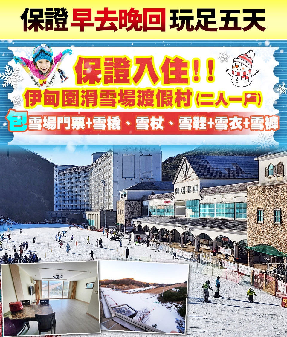 【第2天】 海岸天空膠囊列車(四人一台)→海雲台傳統美食街→伊甸園滑雪場【滑雪樂、堆雪人、打雪杖(提供雪場門票+雪橇、雪杖、雪鞋+雪衣+雪褲)】 |