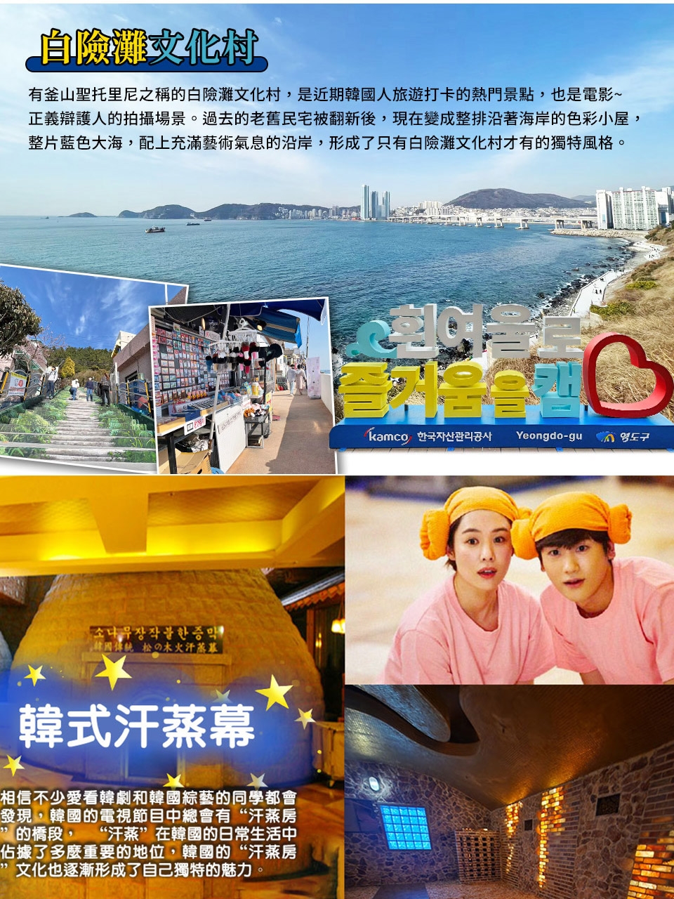 【白險灘文化村+絕影海岸散步路】有釜山聖托里尼之稱的白險灘文化村。是近期韓國人旅遊打卡的熱門景點也是電影~正義辯護人的拍攝場景。過去的老舊民宅被翻新後現在變成整排沿著海岸的色彩小屋整片藍色大海配上充滿藝術氣息的沿岸形成了只有白險灘文化村才有的獨特風格穿梭在不同的小巷中偶爾會發現意外的拍照景點往下走到海灘旁還能欣賞到特殊的石頭海灘景色叉沿岸有許多特色咖啡廳隱藏在民宅中走累了可以挑一家進去喝杯咖啡配上整片蔚藍的海景真的很療癒啊! 早餐:飯店內用 午餐:加耶園內套餐(主餐+韓式湯品+韓式小菜) 晚餐:方便逛街 敬請自理 |