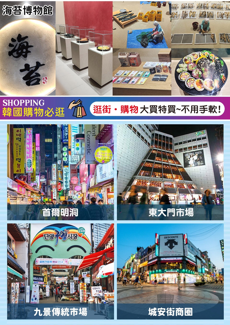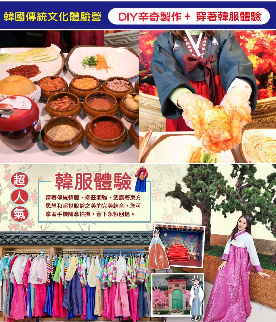 【第4天】 韓國100選~慶熙宮→韓流時尚彩粧店→韓國文化體驗營(DIY辛奇+韓式點心+韓服體驗+海苔博物館)→韓國100選~益善洞韓屋村→新塗鴉秀(含門票)→明洞商圈購物樂 |