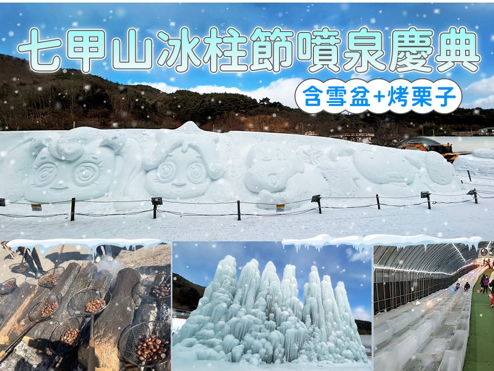 【七甲山冰柱節噴泉慶典(含雪盆+烤栗子)】冬季旅遊樂趣的特色慶典「七甲山噴泉冰柱節」,在忠清南道青陽郡定山面的阿爾卑斯村舉行。現場不僅能欣賞巨大的噴泉冰柱、冰雕,還能進行各種冬季農村體驗。適合來此放鬆身心,留下浪漫美好的回憶。 早餐:飯店內用 午餐:★韓國超人氣推薦★兩頓年糕+麵麵DIY+起司鍋 晚餐:方便逛街 敬請自理 |