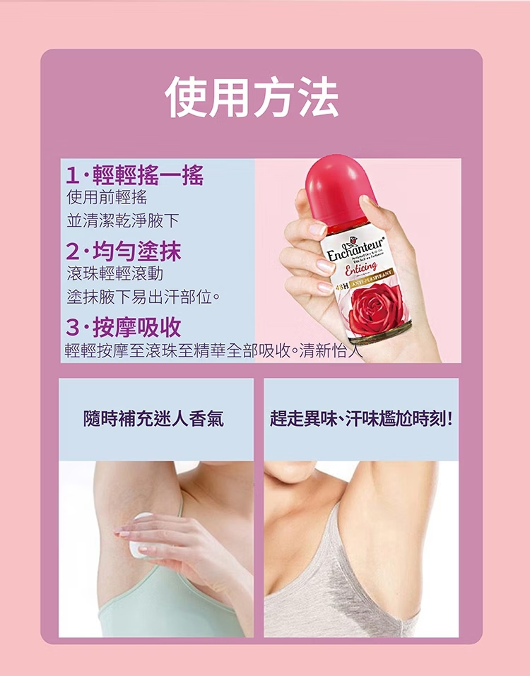 【使用方法】沐浴後或出門前均勻地滾動在腋下。