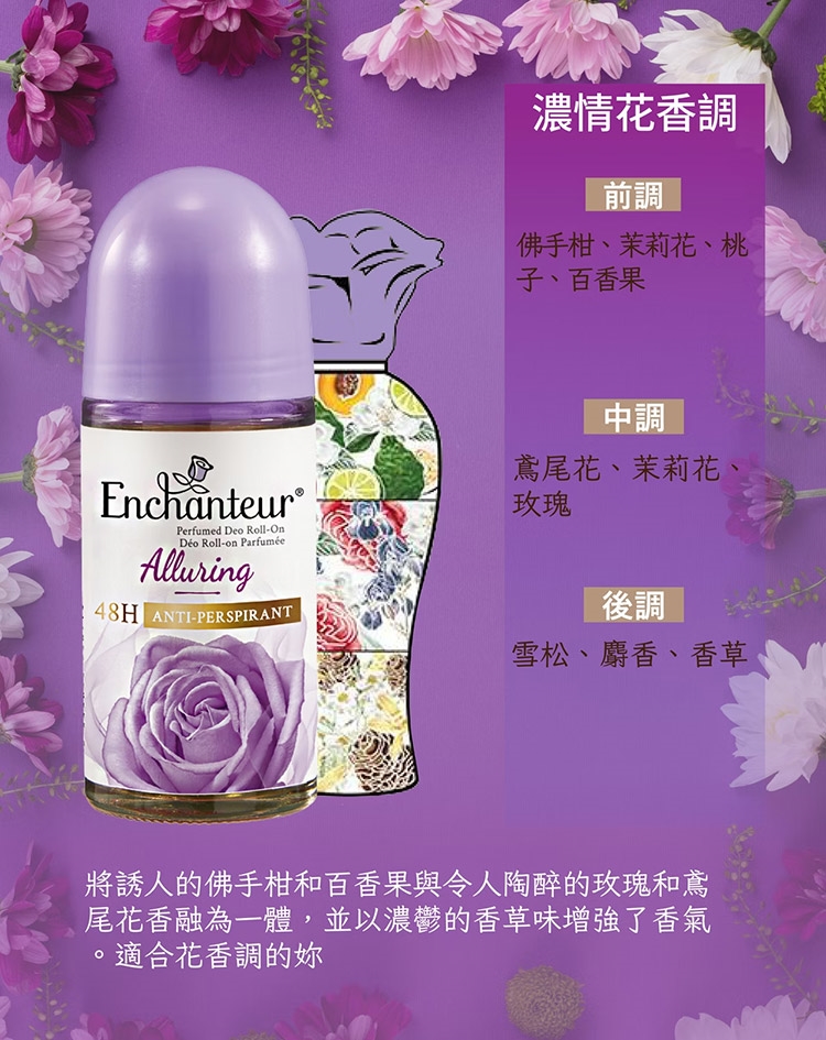 濃情花香(紫):將誘人的佛手柑和百香果與令人陶醉的玫瑰和鳶尾花香融為一體,並以濃鬱的香草味增強了香氣,適合花香調的妳。