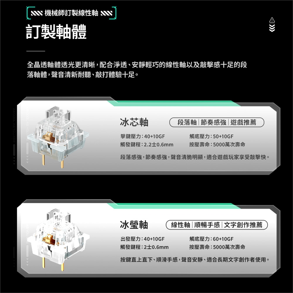 全晶透軸體透光更清晰,配合靜透軸音的冰瑩線性軸,聲音清澈耐聽。